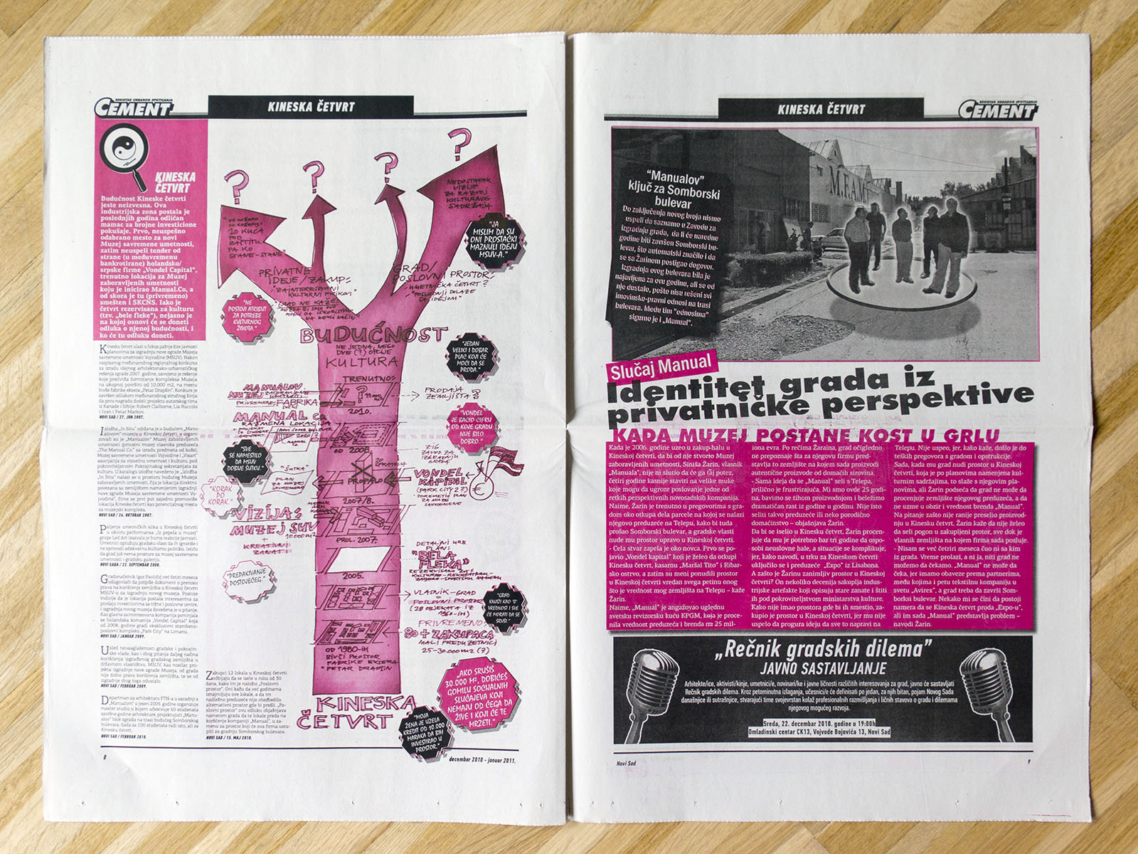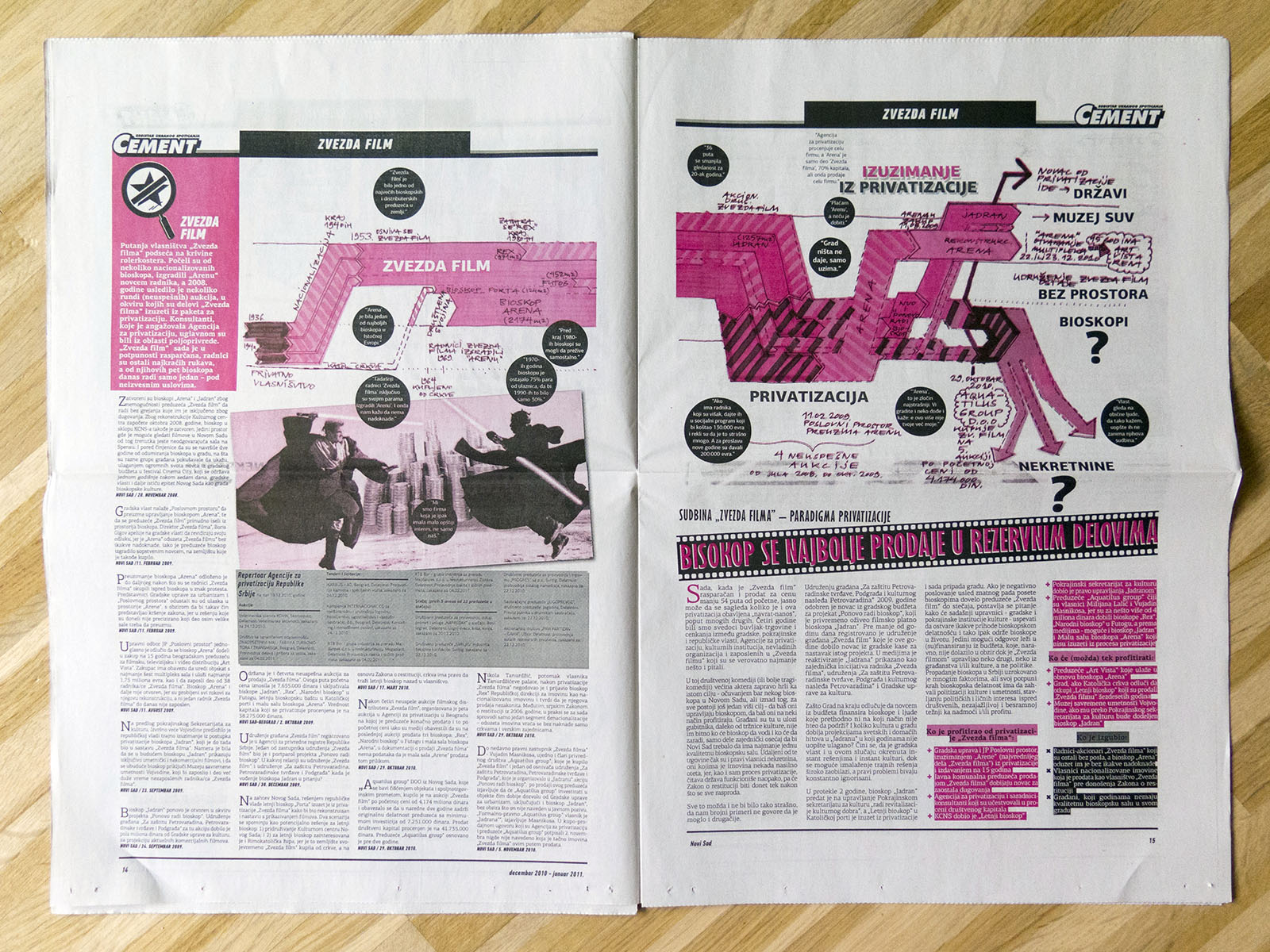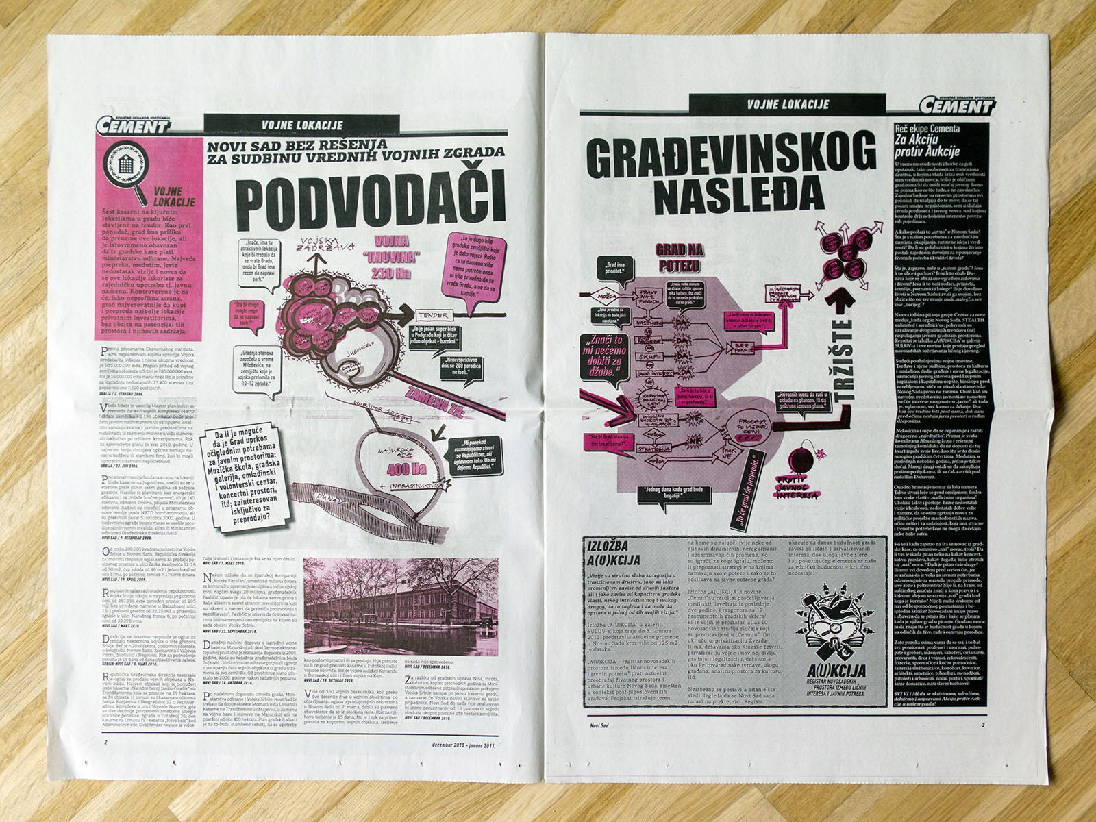 The 24 pages tabloid newspaper Cement, distributed in a print-run of 12.000 copies throughout the city of Novi Sad (December 2010), brings together the findings of A(u)ction – Novi Sad’s Log of Spaces Between Personal Interests and Public Needs in the visual and journalistic language of popular local media.