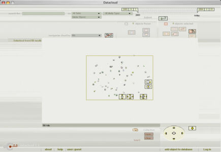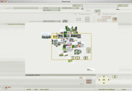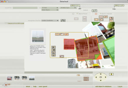 The DataCloud aims at establishing new ways of reading and perceiving multi-layered sets of information. It functions as a ‘knowledge map’ that combines the possibilities of various types of media (text, image, video, sound) and metadata within the framework of a computer-generated 3d environment.