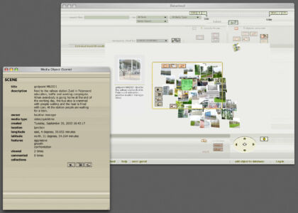 Data clustering is based on the Spring-Mass-System, and according to pre-determined relevant relationships between objects. Reorganisation and loading, as well as filtering of objects are animated. This not only improves the users understanding of what is happening when performing these actions, but also gives the ‘feeling’ of the interaction with a collection of media-objects.