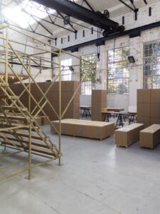 It is Friday September 30th, 2016. At Packe Street in Loughborough (UK), two blue doors swing open towards the majestic, meters tall hall. Flakes of white paint come from the walls of the disused space, and through the glass roof occasionally enters the early autumn sun. It is hard to imagine that decades ago, a massive diesel engine salvaged from the German World War One submarine U-135 would be generating power for Loughborough College in this space. Now, instead of machinery, the 250 square meters site is taken by a large spatial set made out of hundreds of cardboard boxes. Above it, a suspended roof – made of sandwiched cardboard boxes – levitates from meters long ratchet straps, suspended from the roof trusses.