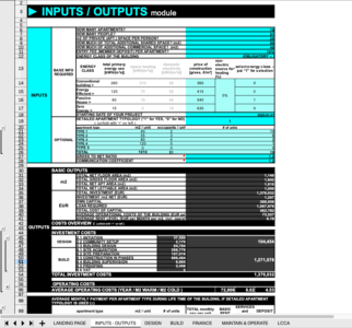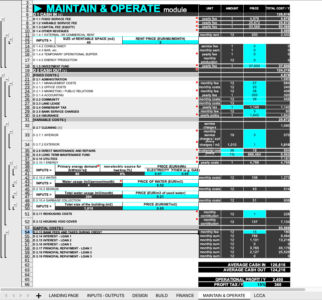 From here, a more detailed overview can get generated. The Design and Build module provides an overview of the actual investment into the project, the Finance module details the structure and cost of capital, while Maintain & Operate brings the logic of keeping the building up & running on the long-term. The LCCA module finally shows the cash-flow, financial performance and viability of a project over the long term (35-years).