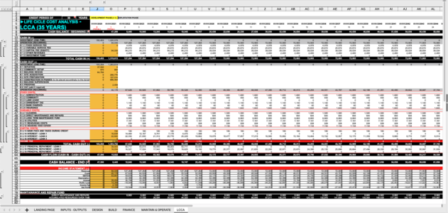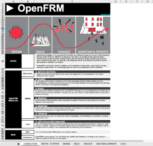 The toolkit is built around a spreadsheet with six different modules: Inputs / Outputs, Design, Build, Finance, Maintain & Operate and finally the Life Cycle Cost Analysis (LCCA).