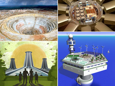 Upgrade Cities: samples / clockwise from left to right: the location for the Siberian eco-city Almaznaya Utopia, a Vivos shelter in the Mojave desert, a proposal for a Seasteading community, and an early image of the Venus project |
