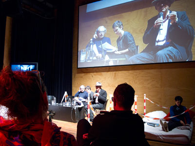 Konrad Becker in conversation with Matteo Pasquinelli during the conference; other speakers included Eric Kluitenberg, Esther MacCallum-Stewart, Ilias Marmaras, Jaakko Stenros and Michiel de Lange |
