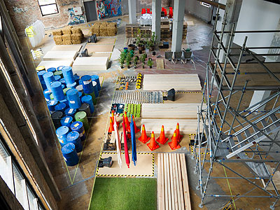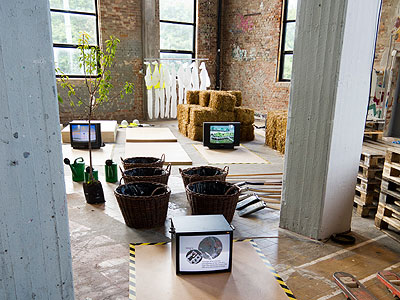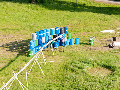 … 2 pallets with 48 bags of sand / 2 pallets with 48 bags of planting soil / 100 wooden beams (45 mm × 70 mm x 3600 mm) / 100 wooden beams (45 mm × 90 mm x 3600 mm) / 300 wooden boards (22 mm × 145 mm x 3600 mm) / 100 plywood 1.22 x 2.44 m x 18 mm / 40 standard euro-size pallets 800 x 1200 mm (used) / 20 straw bales 500 x 500 x 1000 mm / 40 empty barrels / 5 hammers / 1 electric jigsaw / 3 shovels / 5 wheelbarrows / 5 fruit trees (small) / … and much more |