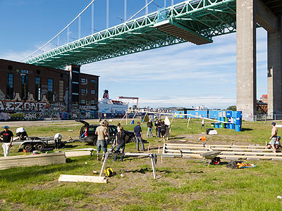 Röda Sten Konsthall, the former thermal plant, sits on a peculiar spot, next to the huge Älvsborg Bridge over the Göta River, literally a few meters beyond the edge of the urban development plan for Gothenburg's waterfront. From this virtual line on, the urban plans are yet uncharted. And although featuring like a desolate field, many have come to like it and use it as a space to hang out along the waterside.
