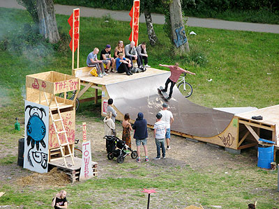 skate ramp, a graffiti wall, an aqueduct, seating elements, a